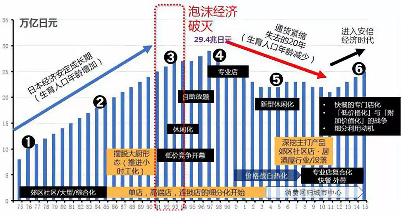 自20世纪60年代日本餐饮行业开始向美国学习,并从1970年开始产业化进程,日本餐饮业用将近50年的时间完成整个产业循环进程。而中国餐饮行业从2000年开始走向连锁,现在的阶段已经基本对标日本餐饮行业上世纪90年代的状态。