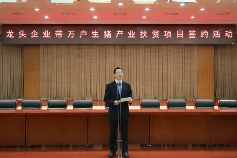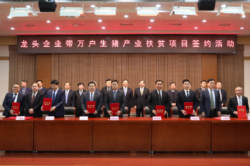 本网讯 12月26日,农业农村部会同国务院扶贫办在京举行“龙头企业带万户生猪产业扶贫项目”集中签约活动。15个生猪养殖龙头企业与湖北恩施州、四川凉山州等16个市(州)政府签订了生猪产业发展合作协议,集中签约项目19个,计划总投资近500亿元,建成投产后,可新增年出栏生猪2200万头的产能,带动贫困地区3.3万农户发展生猪养殖及相关产业。农业农村部部长韩长赋、国务院扶贫办副主任陈志刚出席签约活动并讲话。