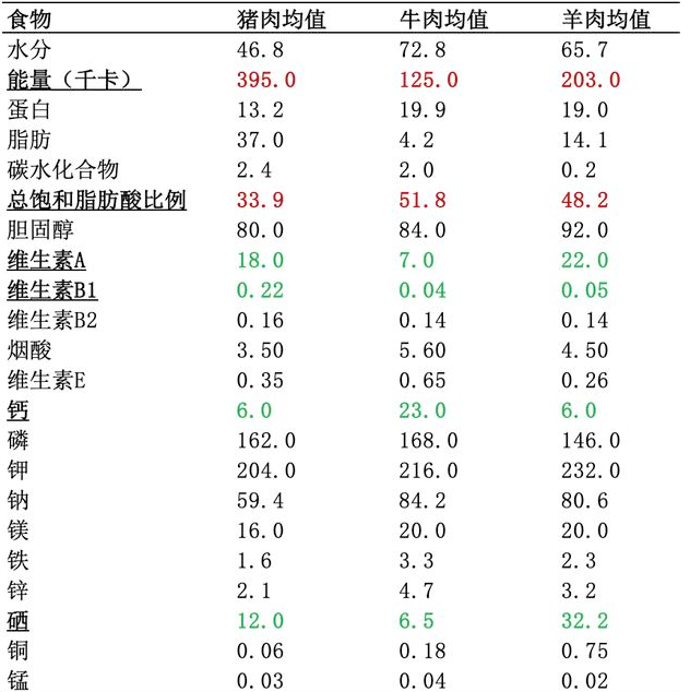 这一方面,虽然猪牛羊肉各有千秋(大家可以看小编在途中标绿色的部分是主要三种肉的差异),猪肉和牛肉中的维生素A和硒显著高于羊肉,而羊肉确比猪牛肉中的钙高一点。