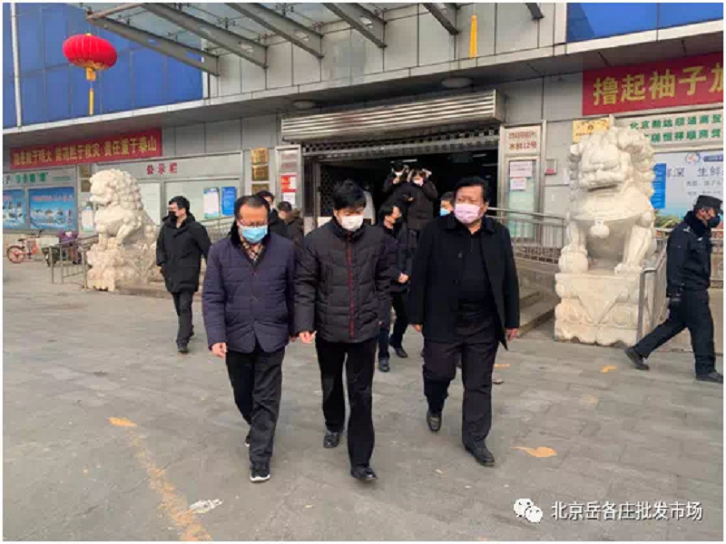 2月13日下午,北京市商务局党组书记、局长闫立刚、丰台区商务局局长凌佩利,在市场书记、总经理戴树森的陪同下对岳各庄市场检查新型冠状病毒肺炎感染期间市场的供应储备保障工作。