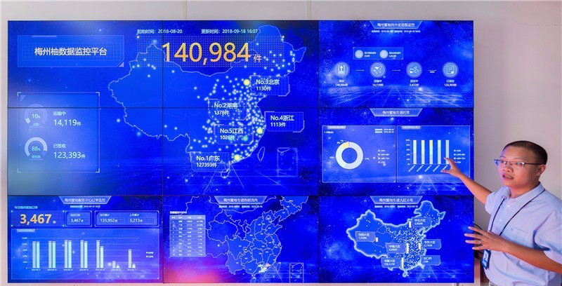 围绕物流大数据,顺丰已打造出丰暴大屏、数据灯塔等产品,可对物流流向、仓储资源进行实时管理、分析,并进行可视化呈现,可以提升果品运输的效率。在梅州柚项目中,顺丰投入了丰暴大屏,对物流数据进行实时监测。
